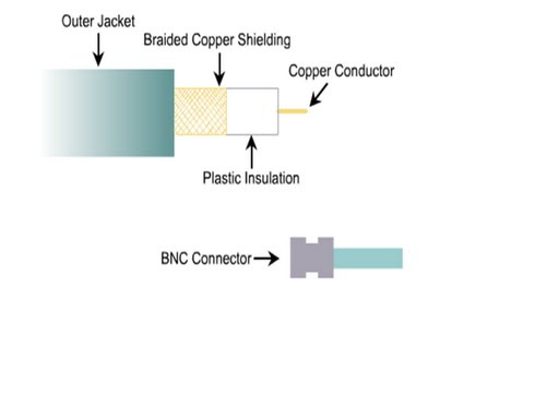 Kabel coaxial biasanya diguanakan pada topologi jaringan bus yang tutik percabangannya menggunakan tconector dan menggunakan konektor bnc untuk koneksi tiap node nya. Kabel coaxial mempunyai pengalir tembaga di tengah centre core.