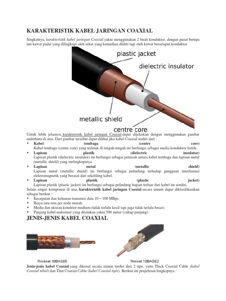 Lapisan plastik dielectric insulator yang mengelilingi. Kabel tembaga centre core yang berada di tengah tengah ini berfungsi sebagai media. Coaxial cable atau kabel koaksial adalah suatu jenis kabel yang menggunakan dua buah konduktor. Jenis kabel ini biasa digunakan untuk jaringan dengan bandwith yang tinggi.