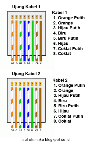Urutan kabel yang menyilang ini tidak semuanya tetapi yang digunakan untuk komunikasi jaringan saja yaitu kabel urutan no 1 2 3 dan 6. Urutan kabel crossover adalah sebagai berikut. Urutan standar kabel straight adalah seperti dibawah ini yaitu sesuai dengan standar tia eia 368b yang paling banyak dipakai atau kadang kadang juga dipakai sesuai standar tia eia 368a sebagai. Tipe kabel ini umumnya digunakan untuk menghubungkan dua perangkat yang berbeda.