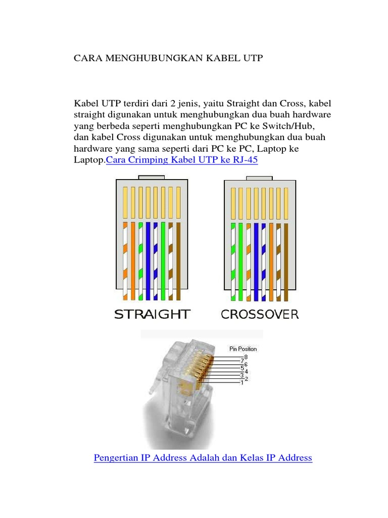 Urutan standar kabel straight adalah seperti dibawah ini yaitu sesuai dengan standar tia eia 368b yang paling banyak dipakai atau kadang kadang juga dipakai sesuai. Misalnya antara komputer dan komputer router dan router switch dan switch hub dan hub. Jenis crossover biasanya digunakan untuk menghubungkan dua perangkat yang sama. Kabel straight kabel straight merupakan kabel yang memiliki cara pemasangan yang sama antara ujung satu dengan ujung yang lainnya.
