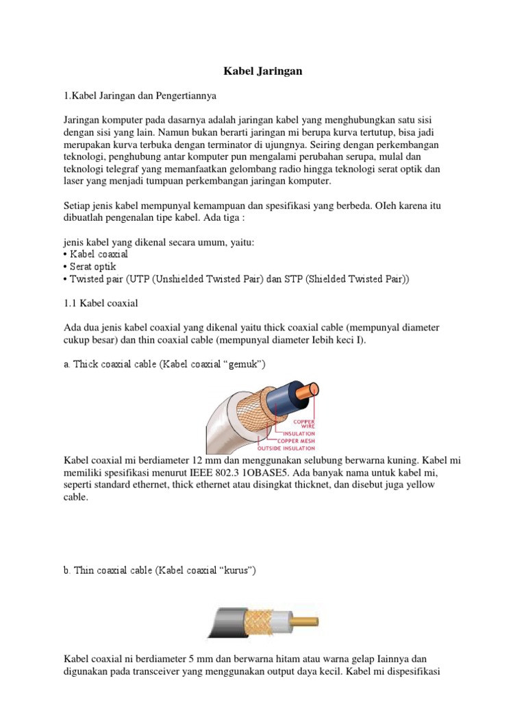 Kabel coaxial merupakan salah satu jenis kabel jaringan komputer yang klasik dan saat ini sudah hampir tidak pernah digunakan lagi untuk penggunaan jaringan kabel pada sebuah sistem jaringan komputer. Dua buah komputer masing masing mempunyai kartu jaringan lalu dihubungkan dengan kabel ataupun nirkabel untuk medium transmisi data serta ada perangkat lunak sistem operasi jaringan akan membentuk sebuah jaringan komupter yang sederhana. Jaringan komputer adalah sebuah sistem atau rangkaian yang terdiri dari dua komputer atau lebih dimana antara satu komputer dengan komputer yang lainnya saling terhubung oleh sebuah sistem komunikasi sehingga memungkinkan setiap komputer yang tergabung dalam jaringan tersebut dapat saling tukar menukar data program dan sumber daya komputer lainnya seperti media penyimpanan printer dan. Ciri dari kabel ini yaitu terdapat 8 jenis kabel dengan warna yang berbeda beda mulai dari coklat putih biru biru putih hijau hijau putih oren dan oren.