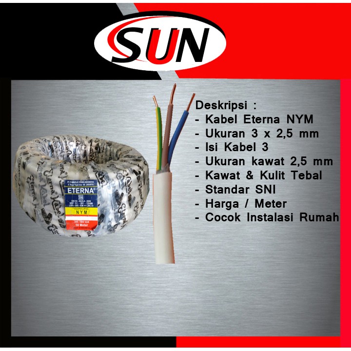 Jual kabel listrik sni merek eterna isi 3 kawat tembaga 2 5mm nym 3x2 5 dengan harga rp11 500 dari toko online elim jaya jakarta timur.