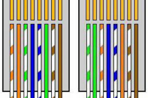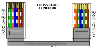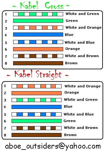 Cara menyusun kabel cross dan straight berdasarkan warna kabel. Gambar dibawah adalah susunan standar kabel cross over.